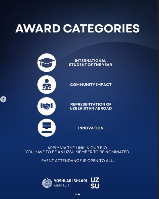 January 6, 2026This award aims to recognize young citizens of Uzbekistan studying abroad who stand out for their knowledge and potential, demonstrate leadership qualities, and actively participate in public life.