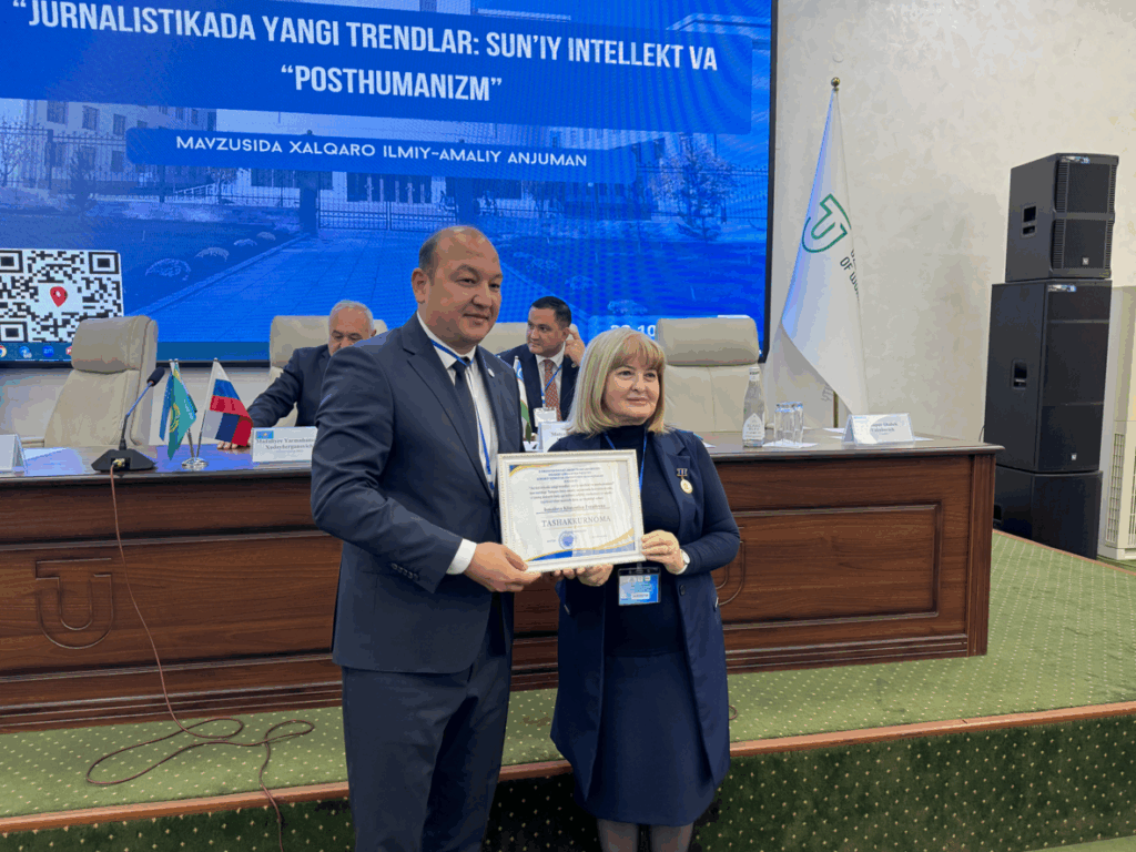Doctor of Philology, Associate Professor Beruniy Alimov, delivered a presentation titled “The Age of Artificial Intelligence in Journalism: Models and Algorithmic Flexibility.” Associate Professor of the South Kazakhstan Research University Yarmuhammad Madaliyev spoke about “Specific Aspects of Using AI in Uzbek Language Education.” Associate Professor of RUDN University (Russia) Natalia Poplavskaya gave an online presentation titled “RUDN Experience: Developing Digital Competencies — From Theory to Practice.”