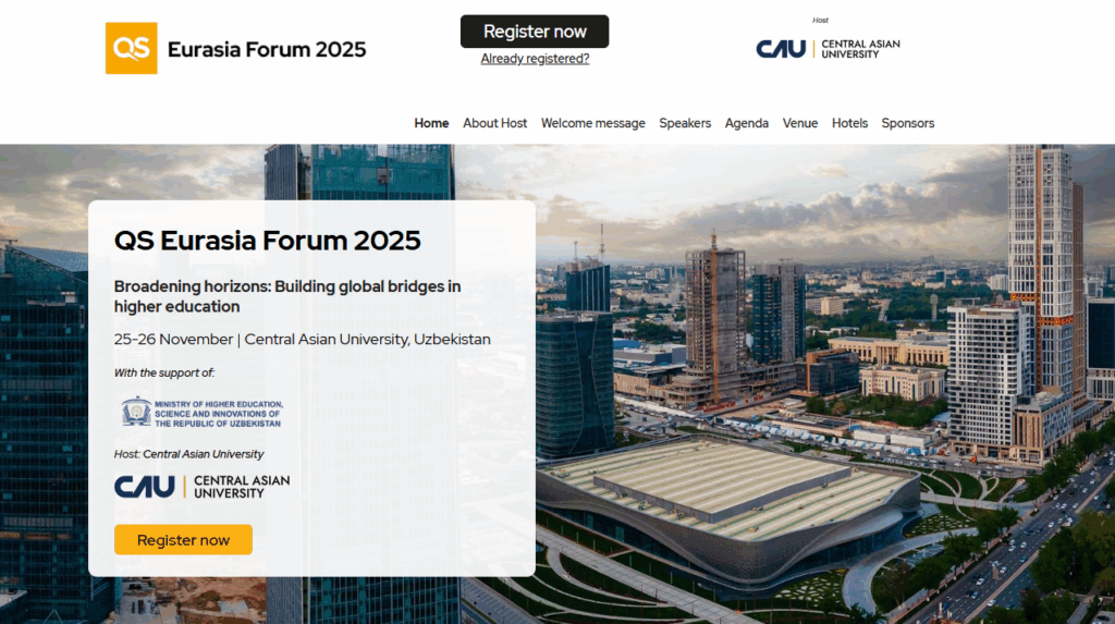 2025-yil 25–26-noyabr kunlari Oliy ta’lim, fan va innovatsiyalar vazirligi ko‘magi bilan Toshkent shahrida xalqaro nufuzli reyting agentligi Quacquarelli Symonds agentligi tomonidan ilk bor “QS Yevroosiyo forumi – 2025” o‘tkaziladi. Tadbirga Central Asian University mezbonlik qiladi.