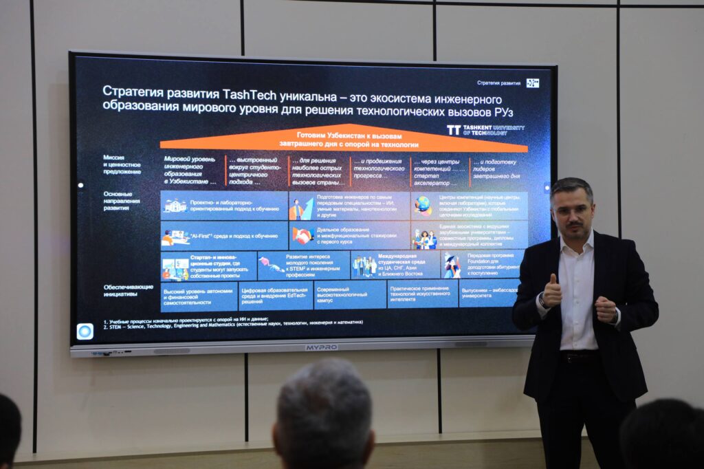 Uchrashuvda “ToshTech”ni Markaziy Osiyoning yetakchi texnologik universitetiga aylantirish, 2040-yilgacha esa dunyoning eng yaxshi 100 ta yosh universiteti qatoriga kiritish bo‘yicha ishlab chiqilgan strategiya taqdim etildi. Bu yo‘nalishda ilg‘or muhandislik tadqiqotlari markazlarini tashkil etish, xalqaro standartlarga mos ta’lim tizimini rivojlantirish ustuvor vazifa sifatida belgilangan.